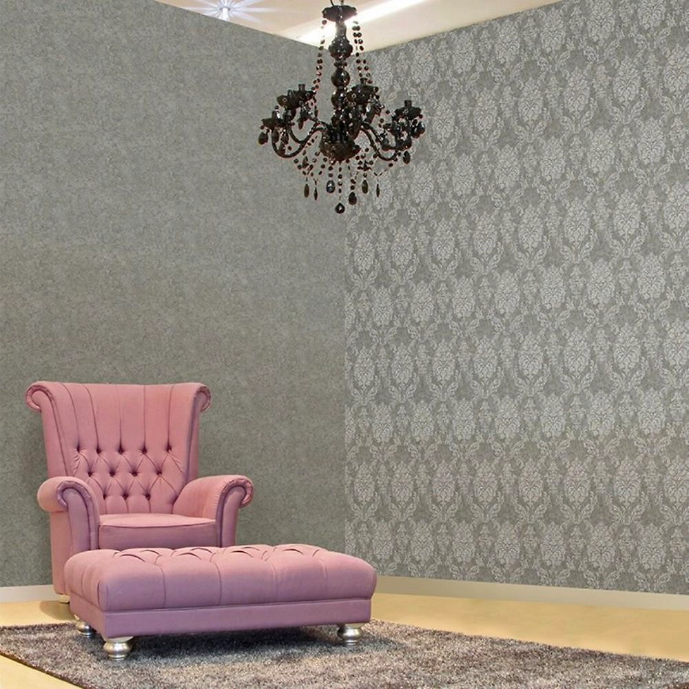 Обои графитового оттенка с роскошным цветочным орнаментом идеальны для оформления зала или гостиной. Такое покрытие привнесет в любой интерьер нотку изысканности и утонченности. Идеально сочетается с фоновыми обоями из той же коллекции.