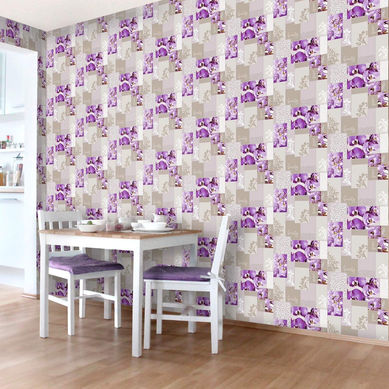 Обои с влагостойким покрытием и нежным рисунком орхидеи гармонично впишутся в столовую.