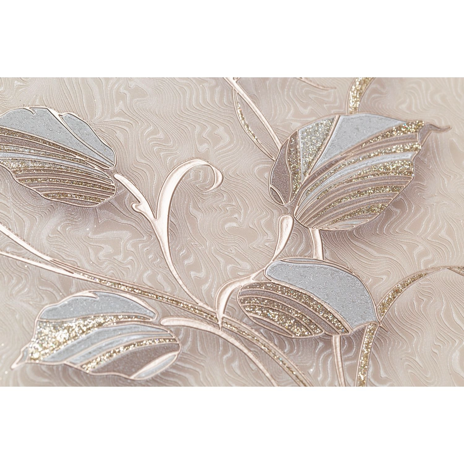Мотив и компаньон связывает воедино оригинальный фон в виде рельефных абстрактных линий. Это настоящий волшебный ингредиент коллекции, ведь достаточно рассмотреть обои под разными углами, чтобы увидеть легкие голографические переливы.