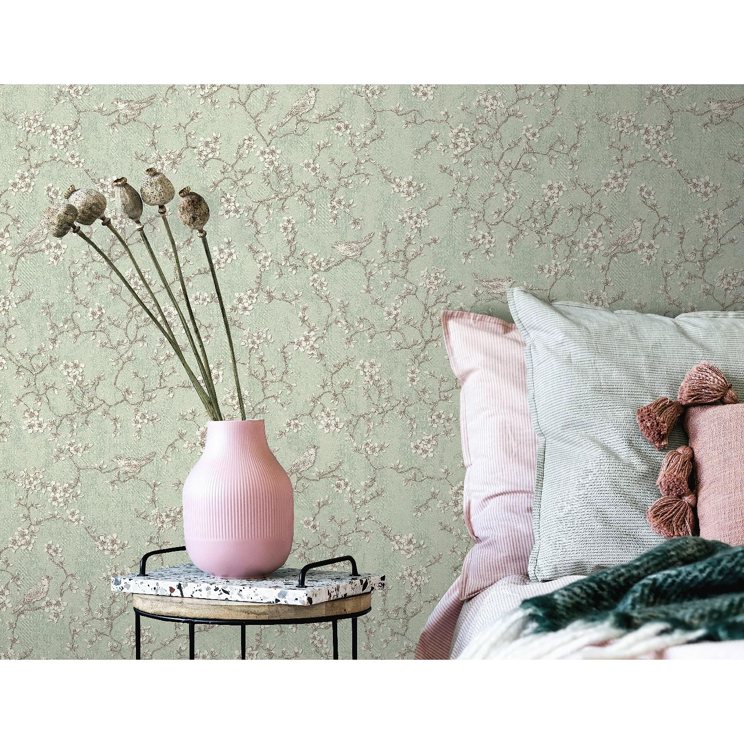 Коллекция обоев Edem - это классический дуэт из мотива и фона. В мотиве изящные веточки молодого деревца обрамлены соцветиями нежных бутонов. Сердцевины цветков посыпаны искрящимся глиттером, который словно роса переливается бликами на солнышке. На ветвях расположились маленькие птички, увлеченно изучающие окружающий пейзаж. Кажется, можно услышать их звонкие трели, отражающиеся от лепестков цветов. Перья птиц также подчеркнуты глиттером, заставляя их буквально сиять. Фон коллекции имеет текстуру с эффектом парчи - плотной, основательной, благородной. Оригинальная замысловатая фактура покрыта металликом, благодаря чему фон гармонично дополняет основной мотив. Коллекция обоев Edem - это воплощение воздушности и легкости, дарящее атмосферу весны, новой жизни и гармонии.