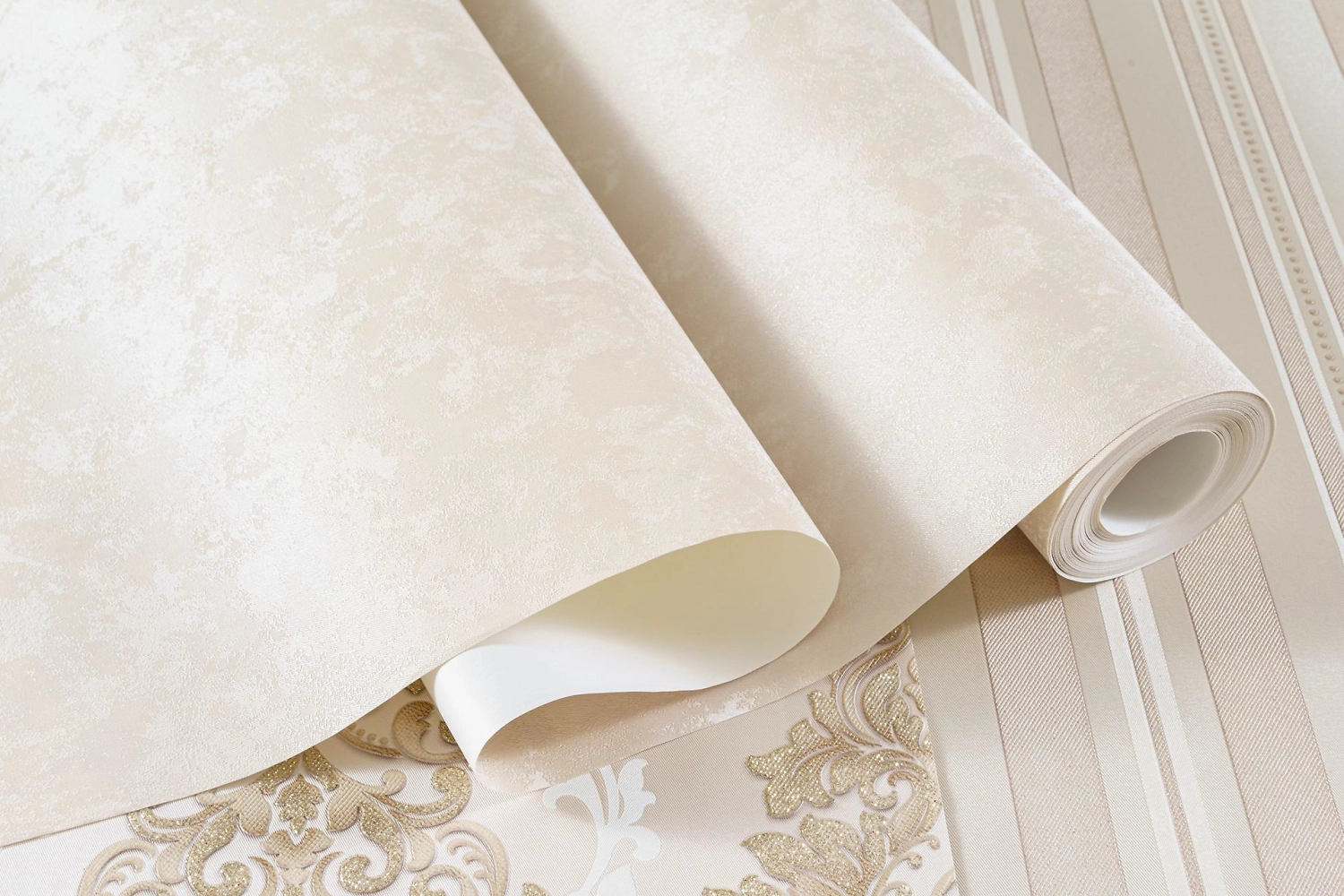 Комбинирование дамаска с однотоном, имитирующем поверхность штукатурки с налетом сатинового блеска, дает возможность для создания классических и исторических интерьеров, а также интерьеров,