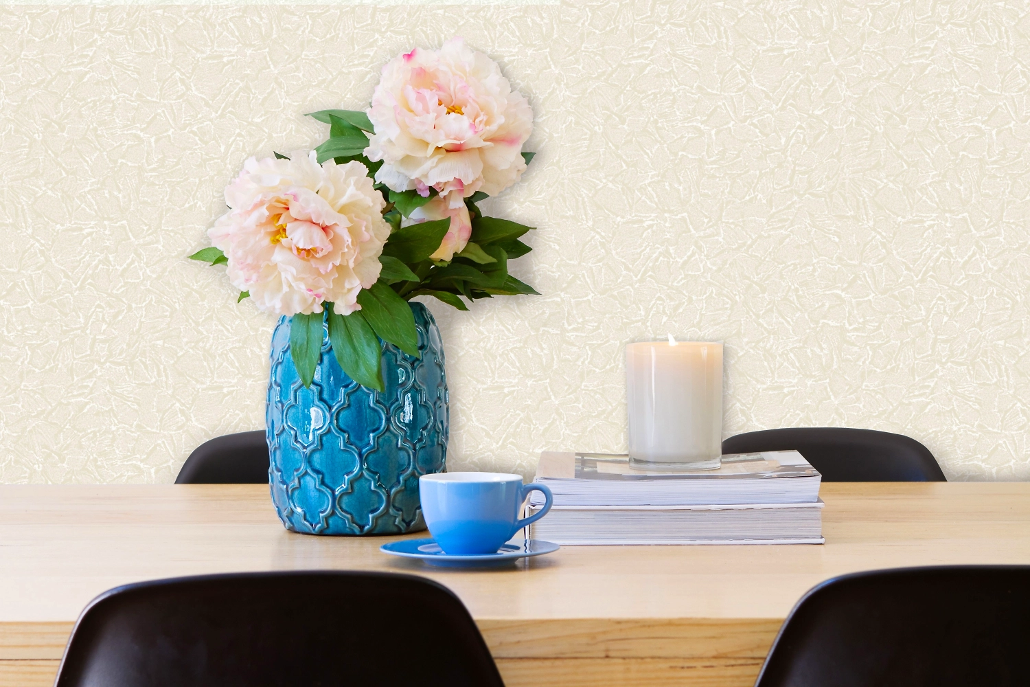 Текстурированные виниловые обои с едва заметным узором предназначены для отделки стен в гостиной, прихожей, спальне, кухне и кабинете. Материал используется как основное интерьерное решение, так и в сочетании с более яркими акцентными обоями.