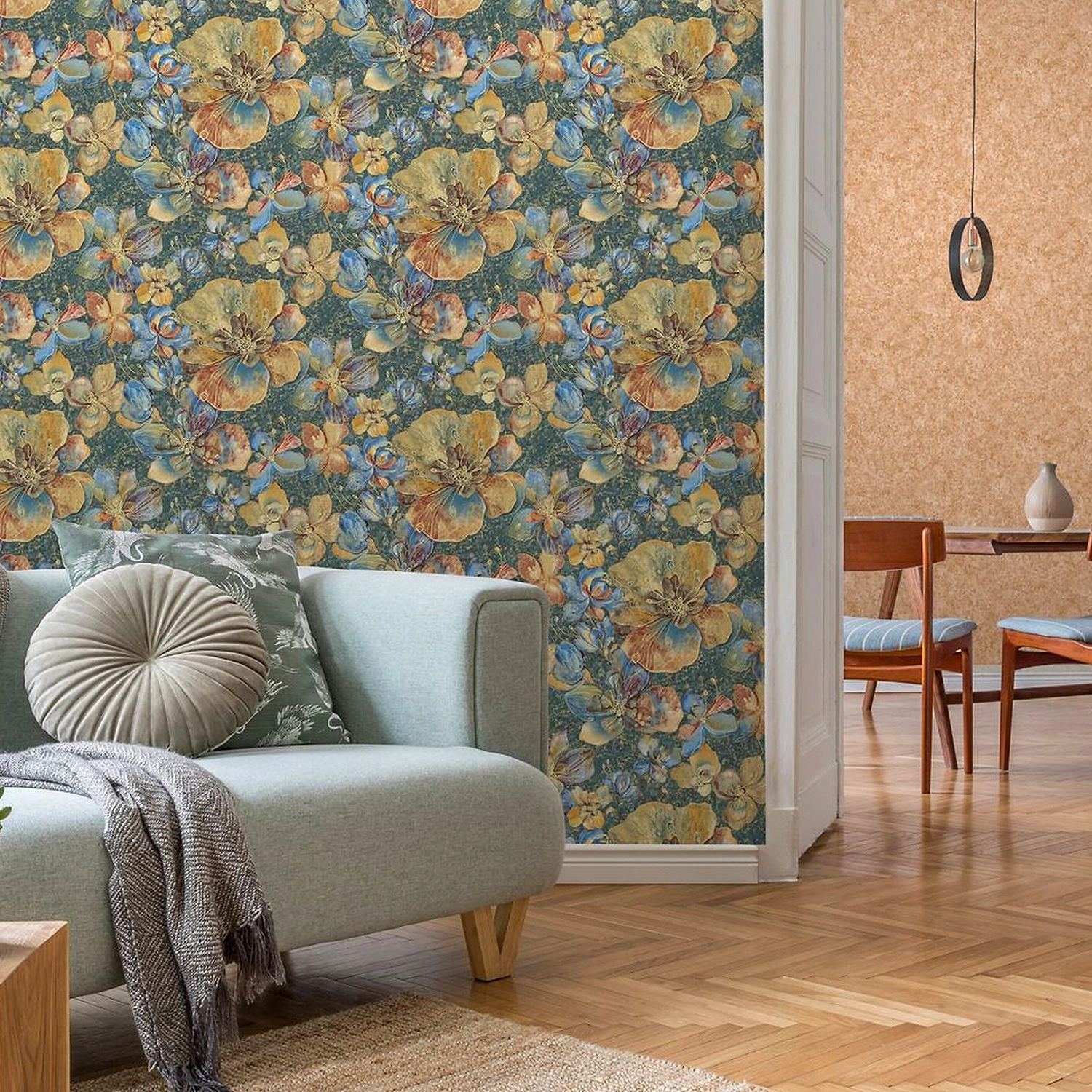 Обои теплого оранжевого оттенка помогут создать интерьер с уютной домашней обстановкой. Имитация оштукатуренной стены станет отличным фоном для традиционных решений и творческих экспериментов.