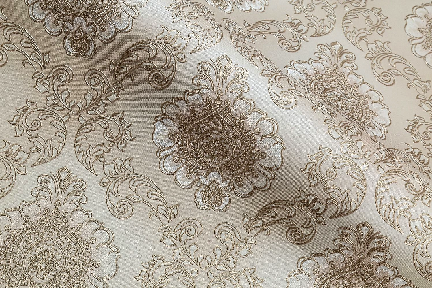 Основой мотива обоев стали филигранные дамаски с этнической ноткой. Их оригинальный рисунок выполнен рельефной металлизированной обводкой на фоне атмосферного радужного градиента. Такое эклектичное смешивание традиционного и современного стиля становится новым прочтением классического узора.