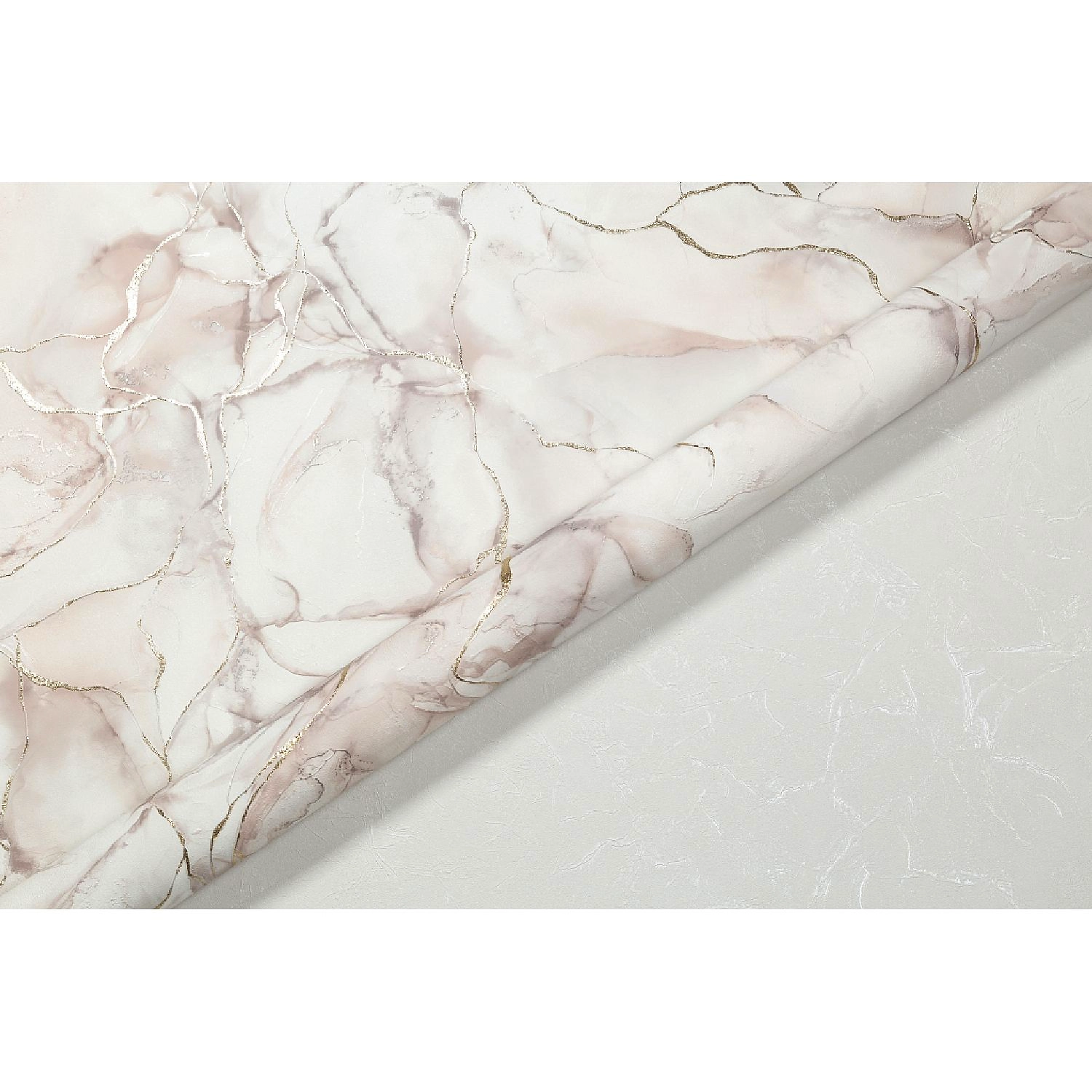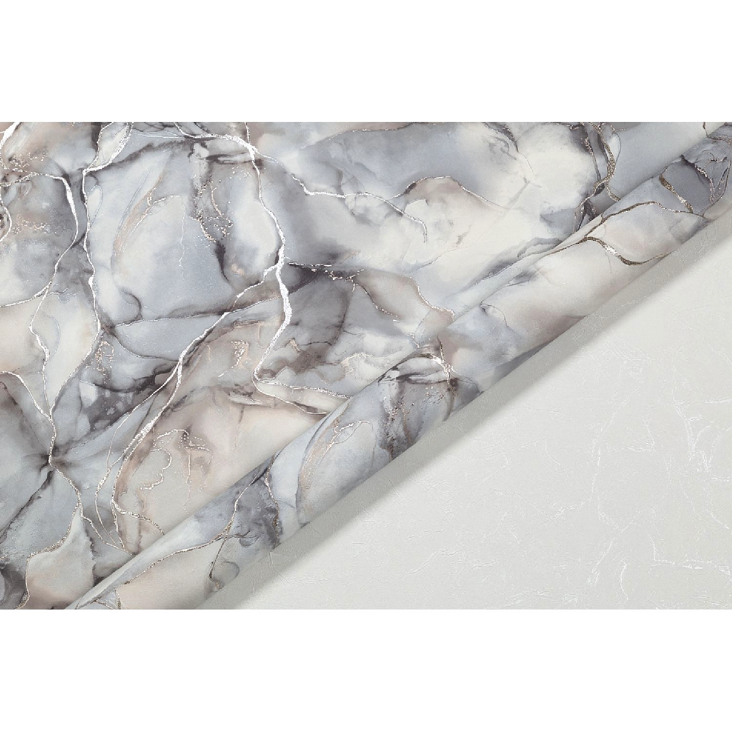 Художественный мотив нарисован в популярной технике абстрактной живописи флюид арт. Жидкие акриловые краски растекаются на холсте и смешиваясь друг с другом, создают мягкие градиентные переходы и рождают десятки глубоких образов. Особенность дизайна – в продуманной композиции: благодаря построению рисунка на всю ширину раппорта, мотив меньше повторяется на стене и не рябит. Компаньон имитирует трендовую штукатурку отточенто с красивыми мраморными переливами.