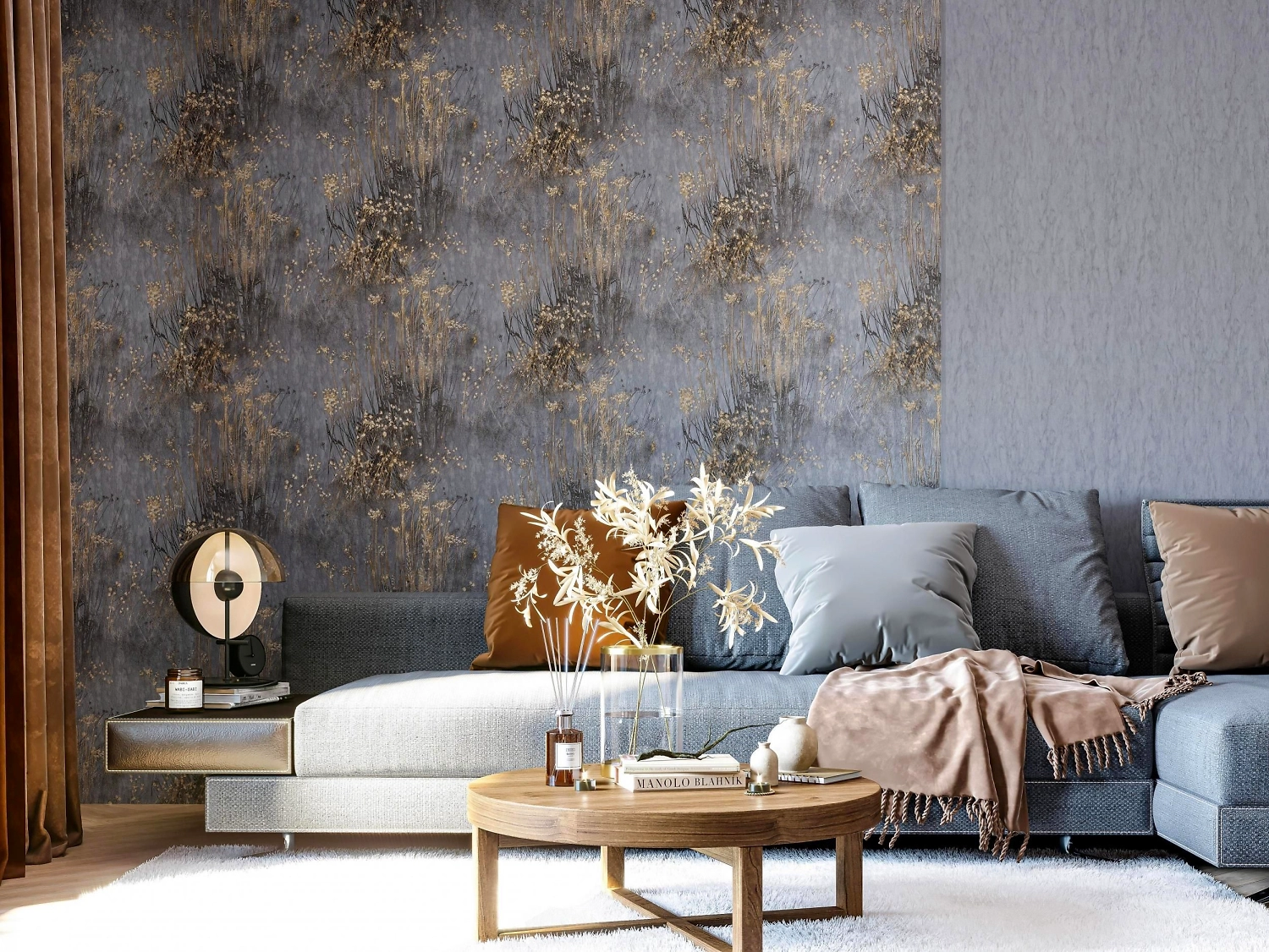 Грациозные цветки травяных колосков, покрытые матовым золотом и украшенные сверкающими блестками - настоящая изюминка коллекции Avignon. Серебристые узорчатые листья выглядят невесомо, а искрящиеся блестки напоминают капельки росы на лепестках. Тисненые контуры рисунка создают выразительный объем и глубину, а модная рельефная текстура - приятные тактильные ощущения. Матовый фон в виде стильной штукатурки, нанесенной художественными мазками - прекрасное полотно для реализации уютных идей в интерьере.