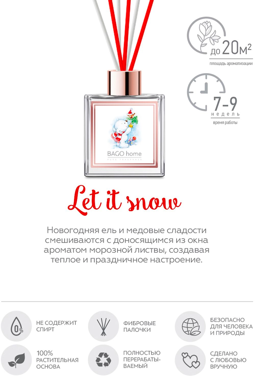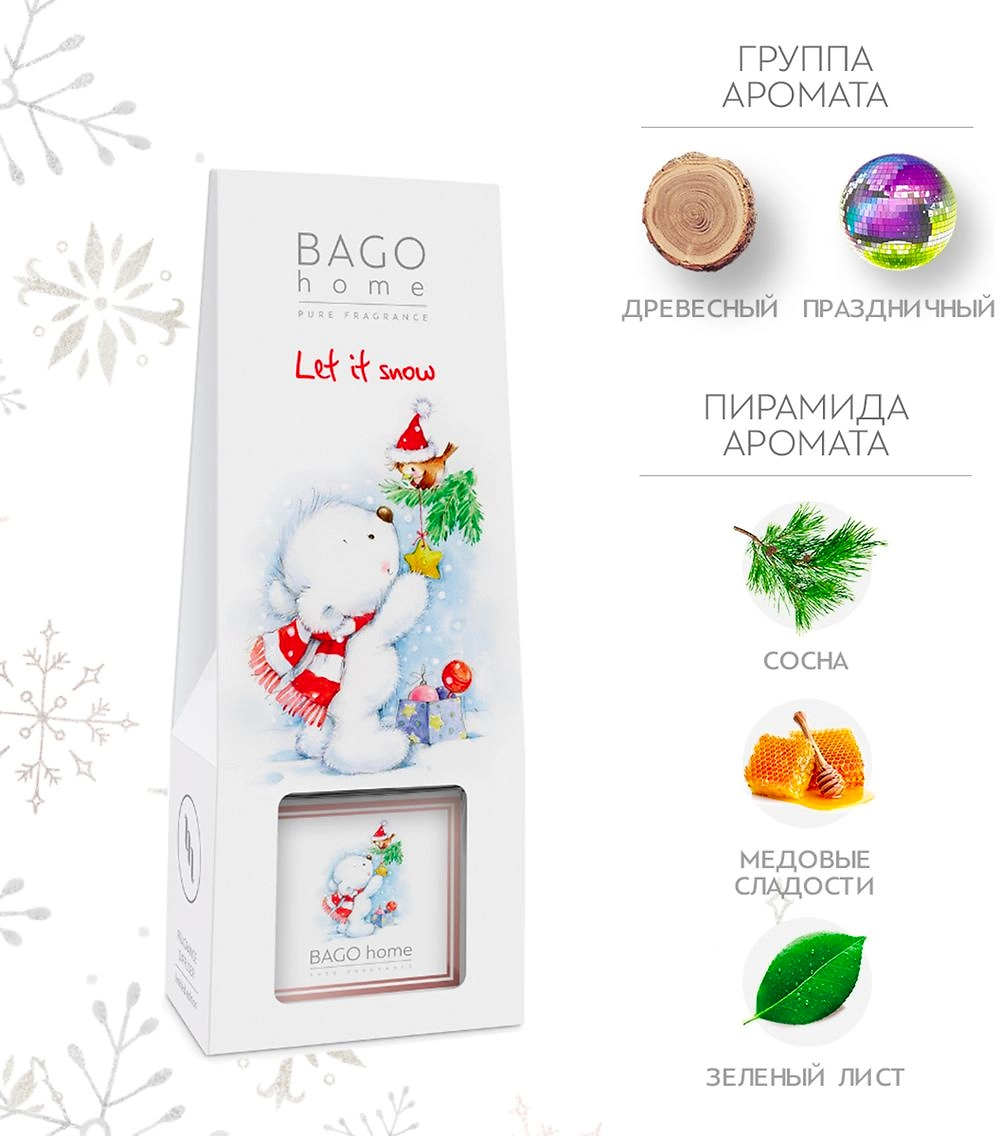 Новогодняя ель и медовые сладости смешиваются с доносящимся из окна ароматом морозной листвы, создавая теплое и праздничное настроение. Ароматический диффузор 75 мл: 1.Время работы: 7-9 недель 2.Площадь ароматизации: 10-20 м² 3.В комплекте 5 фибровых палочек из прессованного волокна Коллекция ароматов Тот самый Новый год Новая дизайнерская коллекция чудесных ароматов для дома от BAGO home создаст новогоднее настроение в вашем доме с помощью волшебных ароматов хвои, пряностей, фруктов и душистых трав, собранных в композиции, вдохновляющие мечтать.​ Ароматические диффузоры из этой коллекции украшены трогательными иллюстрациями художницы Марины Федотовой.