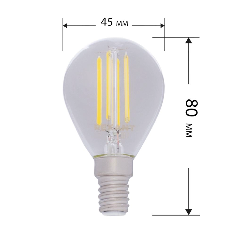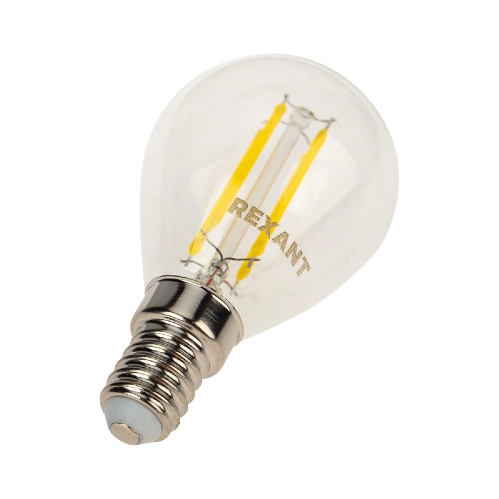 Филаментная прозрачная лампа REXANT GL45 в форме шара мощностью 7.5Вт с цоколем E14 и с белым свечением в 4000K прекрасно подходит для дизайнерского освещения комнат, домов, гостиниц, кафе, и других объектов.