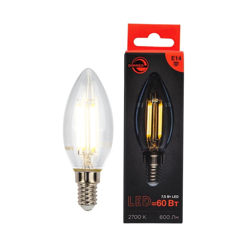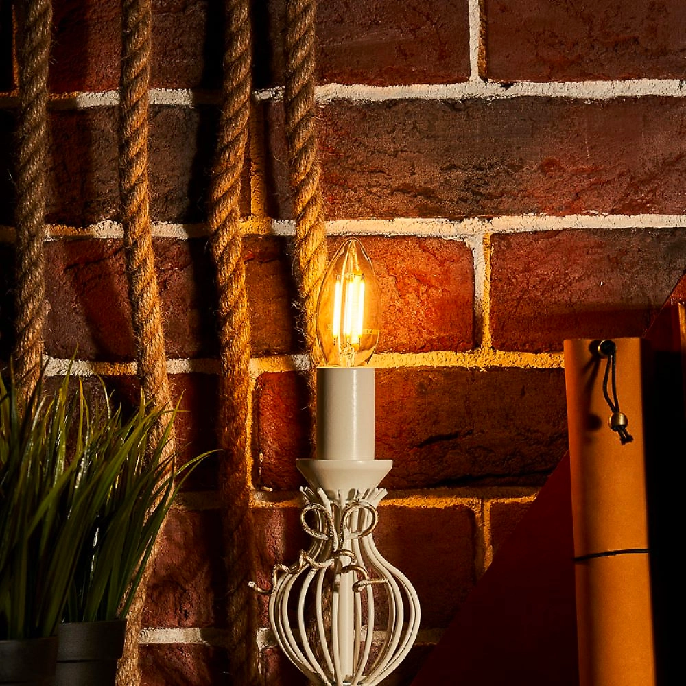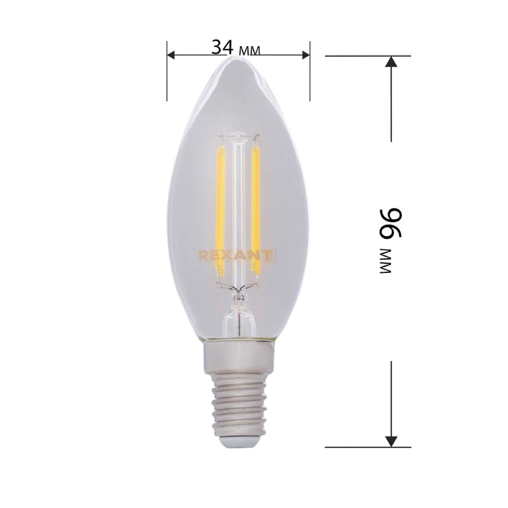 Филаментная прозрачная лампа REXANT CN35 в форме свечи мощностью 7.5Вт с цоколем E14 и с теплым белым свечением в 2700K прекрасно подходит для дизайнерского освещения комнат, домов, гостиниц, кафе, и других объектов.