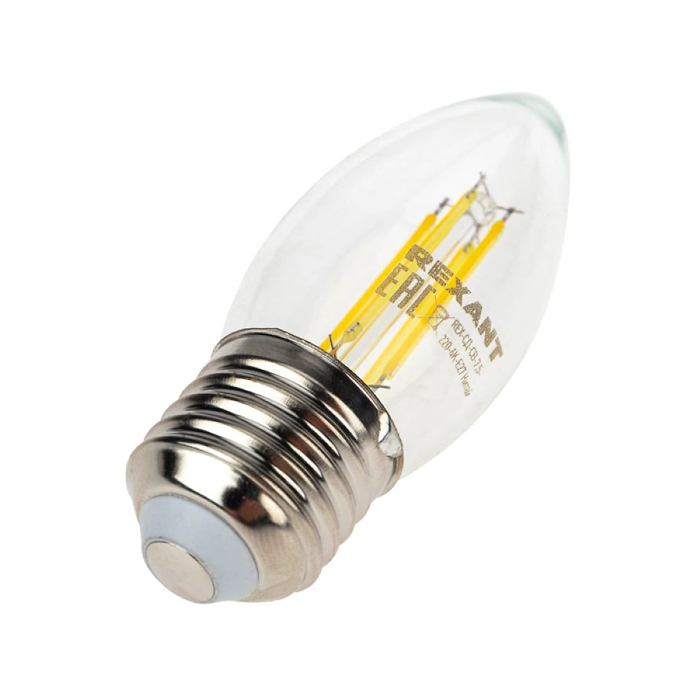 Филаментная прозрачная лампа REXANT CN35 в форме свечи мощностью 7.