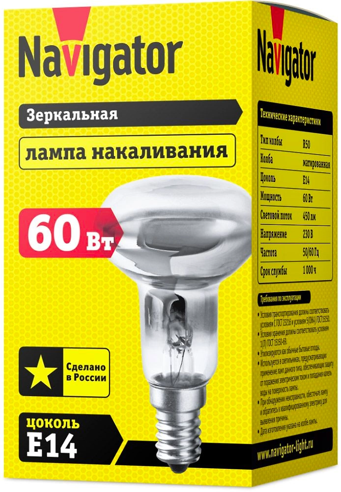 Зеркальная лампа накаливания Navigator выполнена в форме гриба. Двойная спираль, наличие предохранителя.