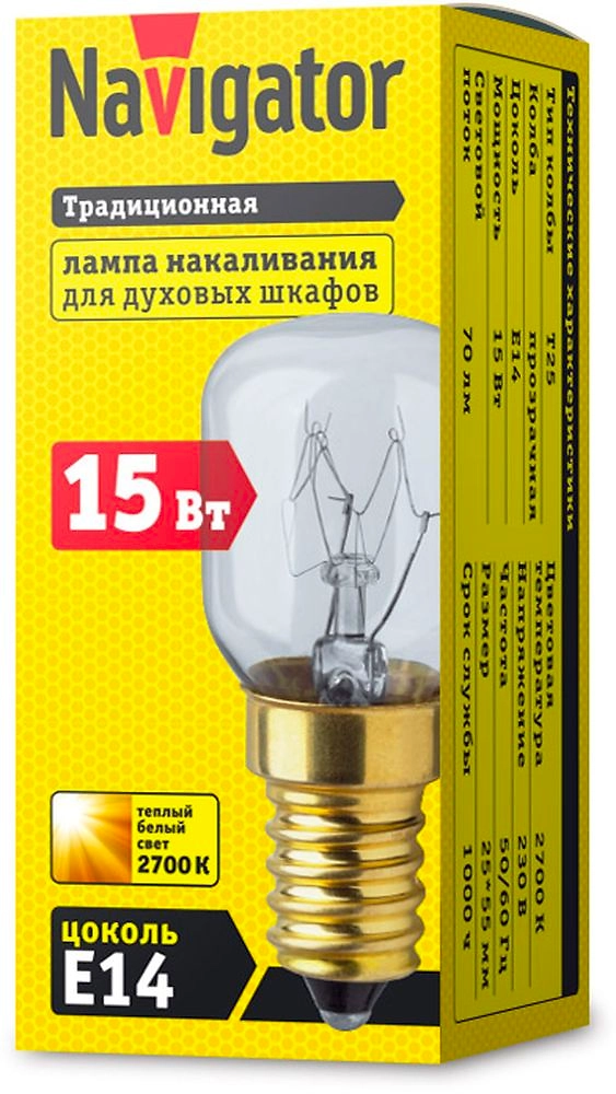Лампа накаливания Navigator для духовых шкафов выполнена в форме T25.