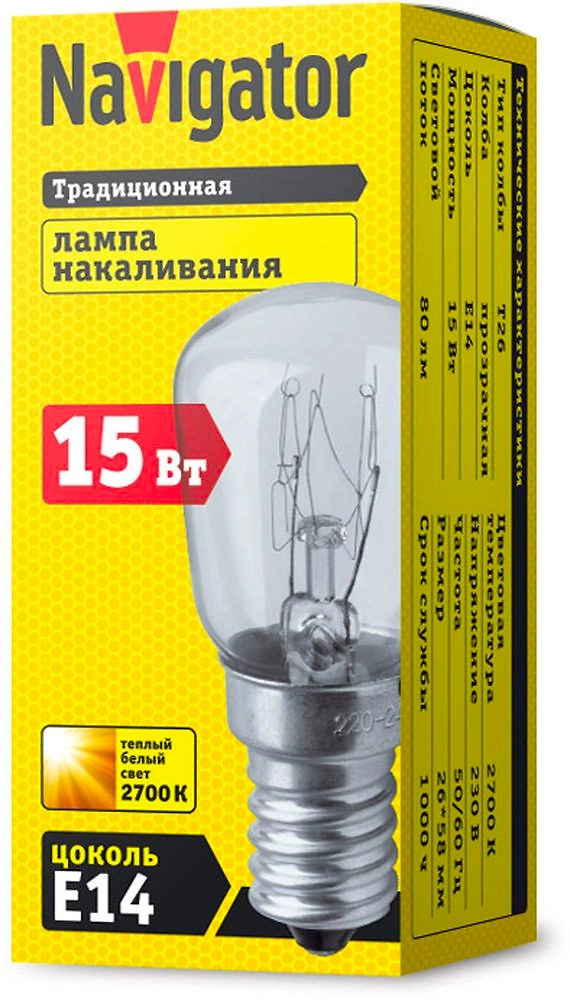 Лампа накаливания Navigator выполнена в форме T26. Двойная спираль, наличие предохранителя.
