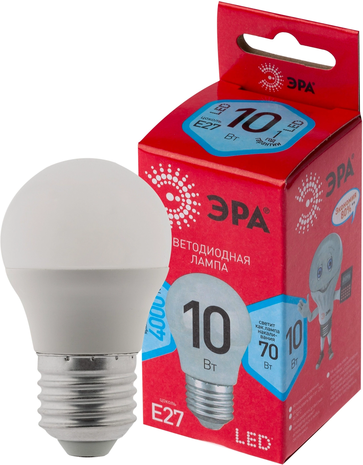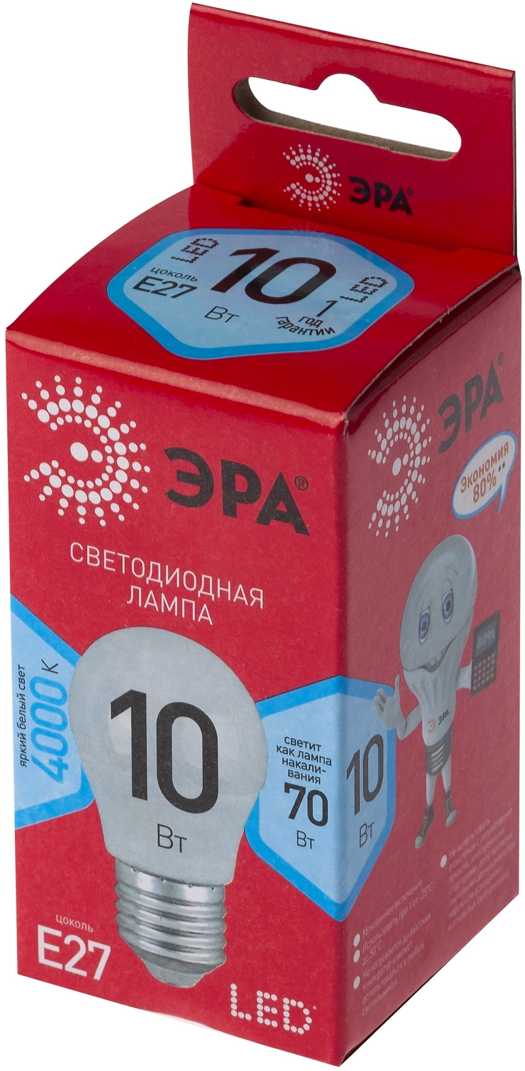 Светодиодная лампа ЭРА ECO Е27 10 Вт 800 лм 4000 К шар - энергоэффективный аналог вольфрамовой лампочки мощностью 60 Вт.