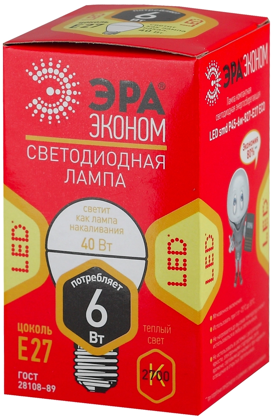 Светодиодная лампа ЭРА ЭКО E27 6 Вт 480 лм 2700 К шар