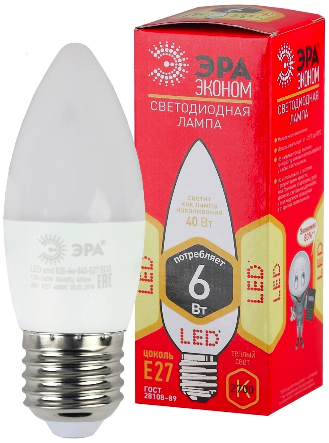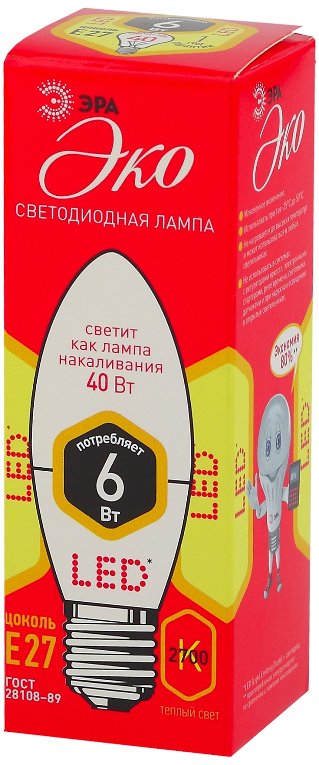 Светодиодная лампа ЭРА ЭКО E27 6 Вт 480 лм 2700 К свеча