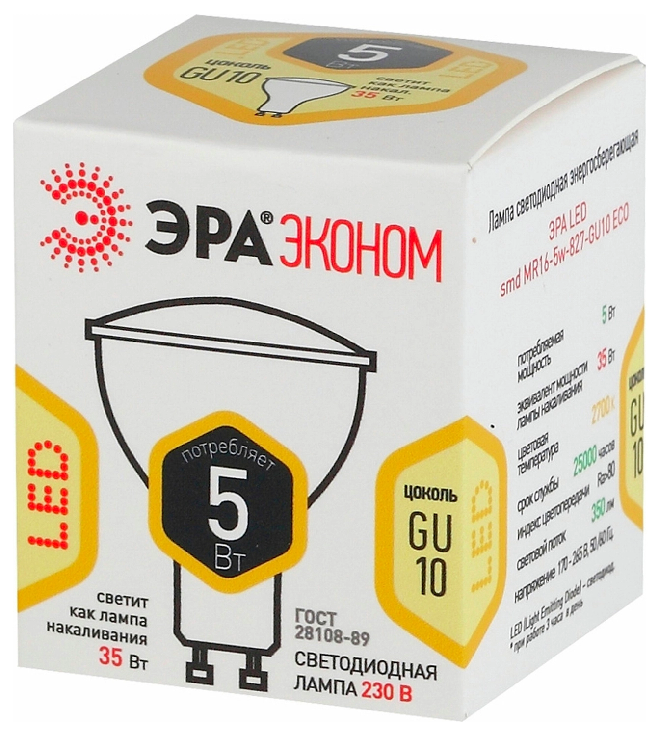 ЭРА ECO GU10 5 Вт - экономичная светодиодная лампа для точечных светильников и встроенной подсветки.