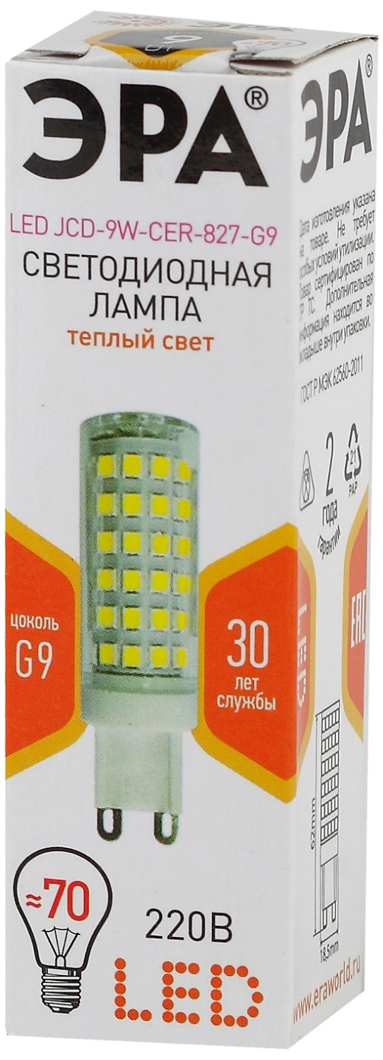 Лампа LED ЭРА капсула мощностью 9 Вт излучает световой поток 720 Лм. Небольшой капсульный элемент по уровню яркости сопоставим с лампочкой накаливания мощностью 70 Вт. Расстояние между штырьками цоколя G9 составляет 9 мм.