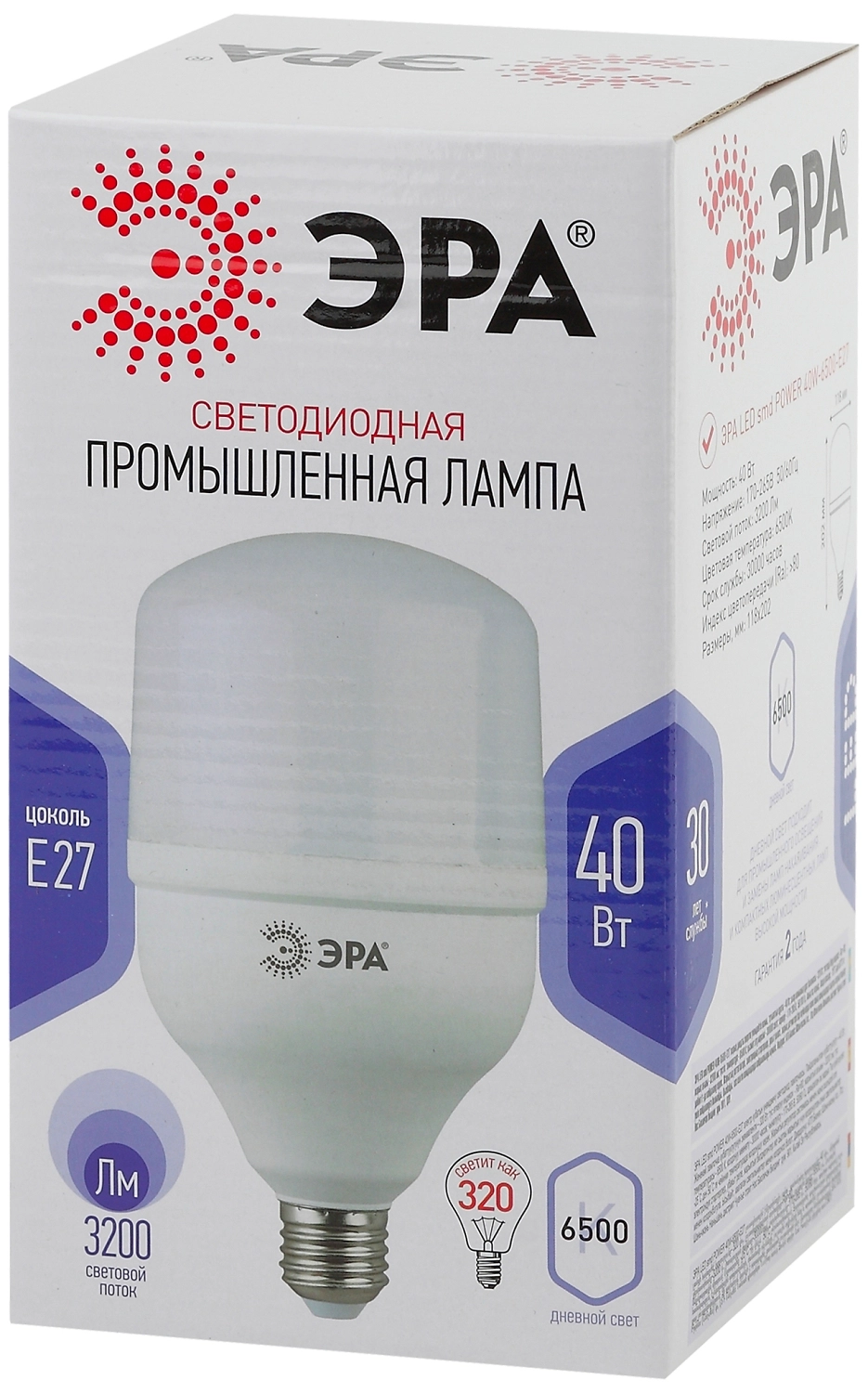 ЭРА LED POWER E27 40 Вт 3200 лм 6500 К - промышленная светодиодная лампа высокого класса энергоэффективности. Является аналогом вольфрамовой лампочки мощностью 250 Вт.