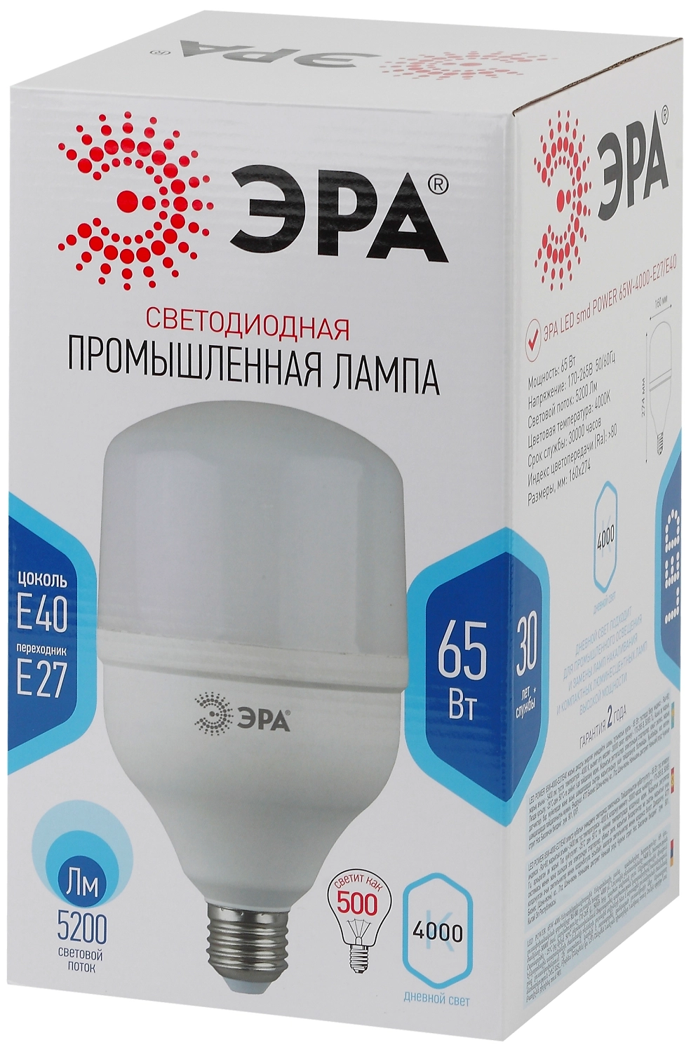 LED ЭРА E27 65 Вт 5200 лм 4000 К груша - светодиодная промышленная лампа высокой мощности с рабочим ресурсом 30 000 часов.