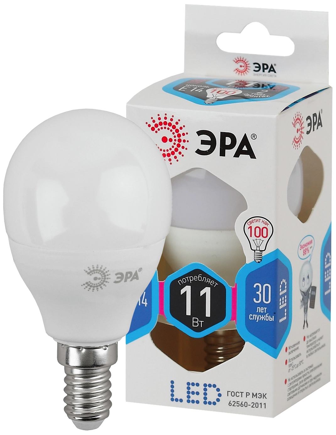 Светодиодная лампа ЭРА P45 с цоколем E14 и колбой в форме шара, потребляя всего 11 Вт, создает световой поток эквивалентный лампе накаливания 100 Вт, экономит до 90% электроэнергии, сокращает расходы