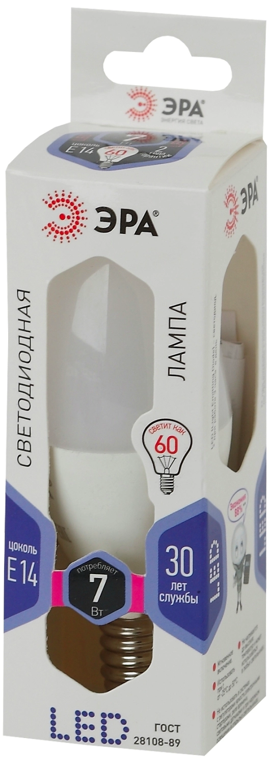 Светодиодная лампа ЭРА с цоколем E14 и колбой в форме свечи при мощности всего 7 Вт по яркости эквивалентна лампе накаливания 60 Вт, экономит почти 90% электроэнергии и заметно сокращает расходы.