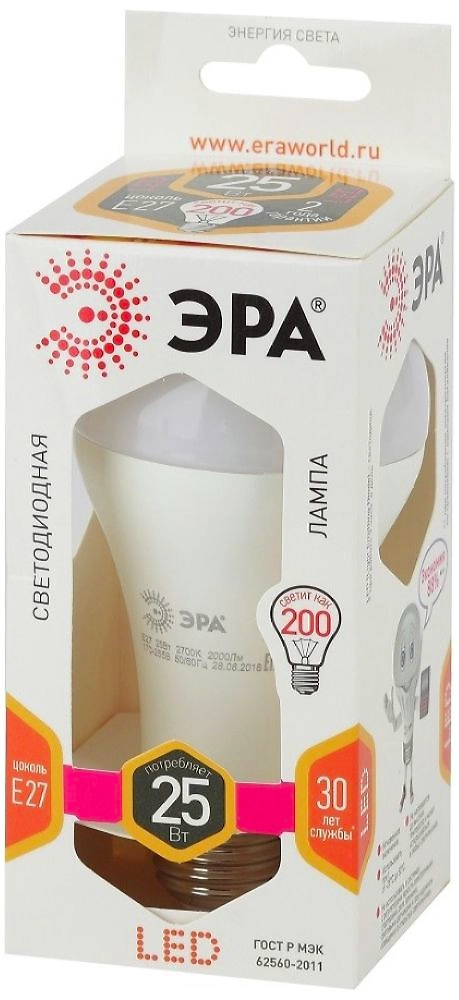 Лампа LED ЭРА груша мощностью 25 Вт излучает световой поток 2000 Лм. Современный источник света с колбой в форме груши и традиционным винтовым цоколем E27 внешне похож на лампу накаливания, но потребляет электроэнергии на 88% меньше.