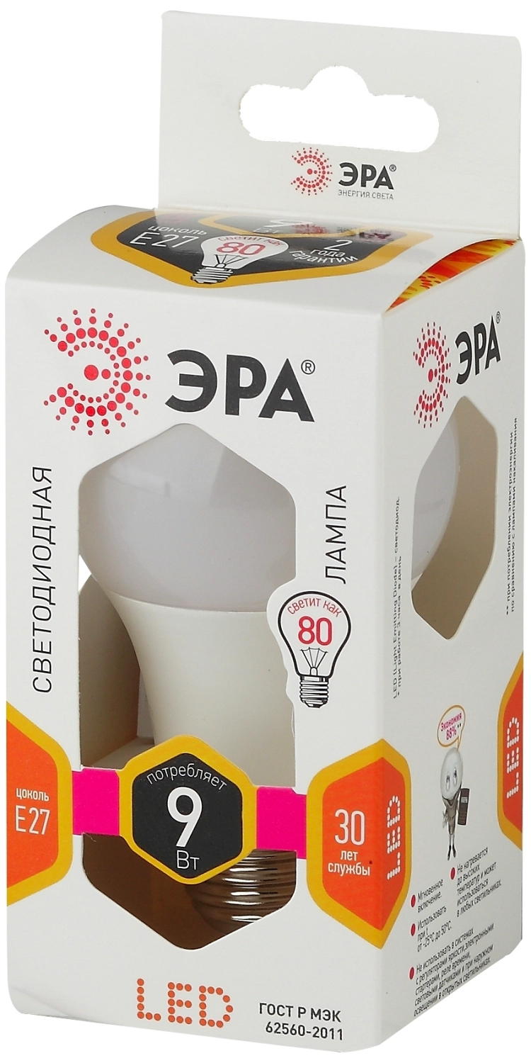 Лампа LED ЭРА мощностью 9 Вт имеет классическую форму груши и традиционный винтовой цоколь E27.