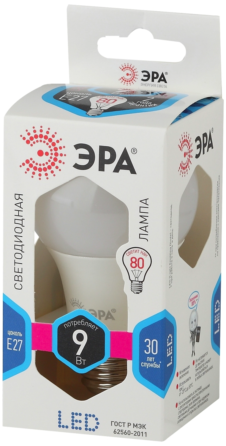 Лампа LED ЭРА мощностью 9 Вт - современный экономичный источник света с классической формой груши и традиционным винтовым цоколем E27.