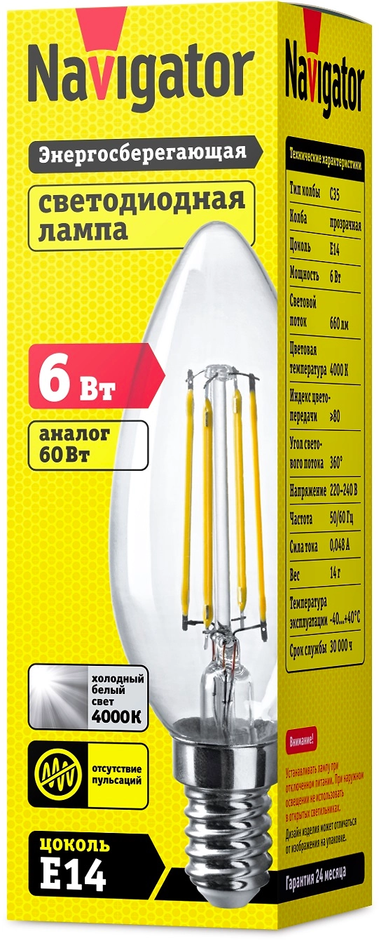 Светодиодная лампа Filament свеча 1хЕ14х6 Вт 4000К