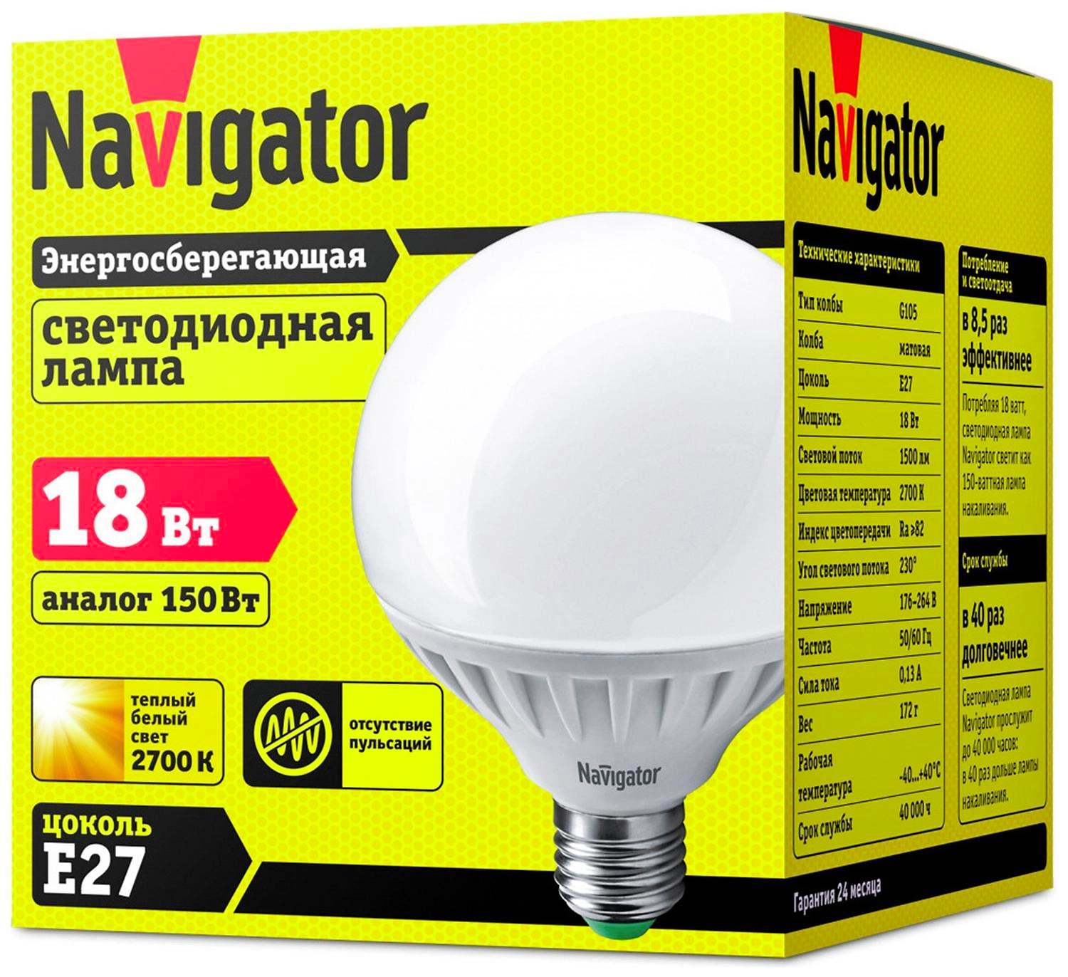 Светодиодная лампа Navigator NLL-G Е27 18 Вт 1500 лм 2700 К шар - мощный энергоэффективный источник питания, идентичный вольфрамовым лампочкам 150 Вт.