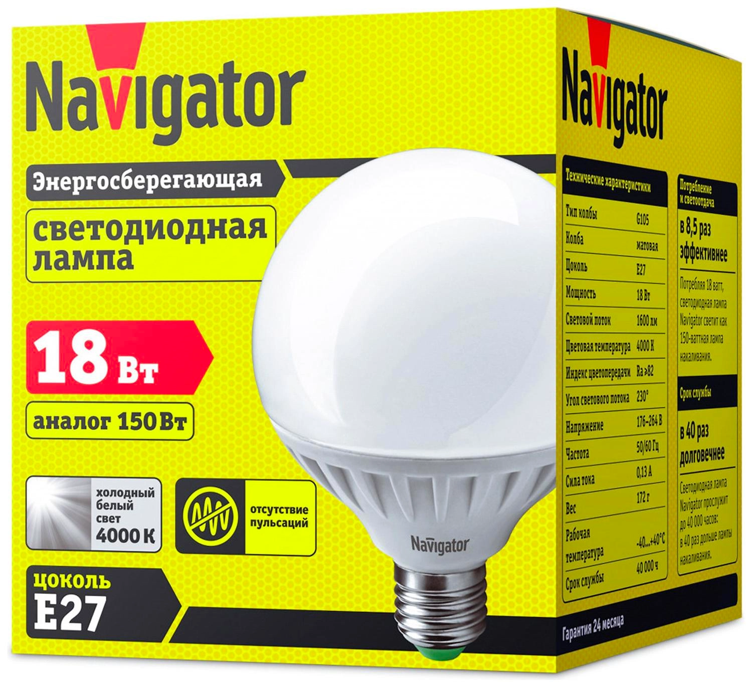 Светодиодная лампа Navigator NLL-G Е27 18 Вт 1600 лм 4000 К шар идентична вольфрамовым лампочкам мощностью 150 Вт. Изделие относится к классу энергоэффективности А, рабочий ресурс - 40 000 часов.