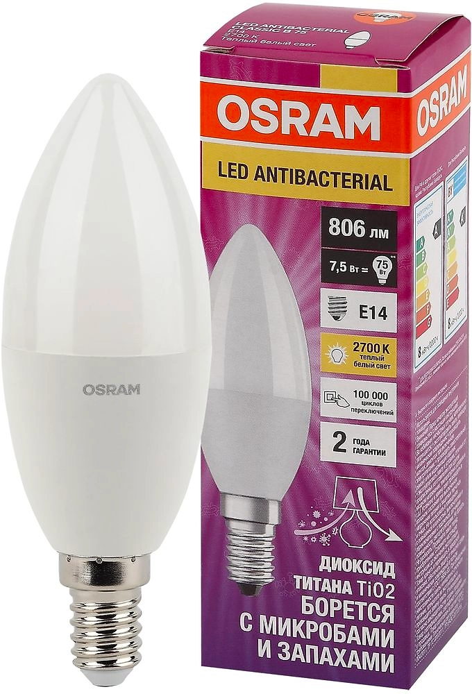 Светодиодная лампа OSRAM Antibacterial Classic 7,5 Вт 806 лм 2700 К свеча