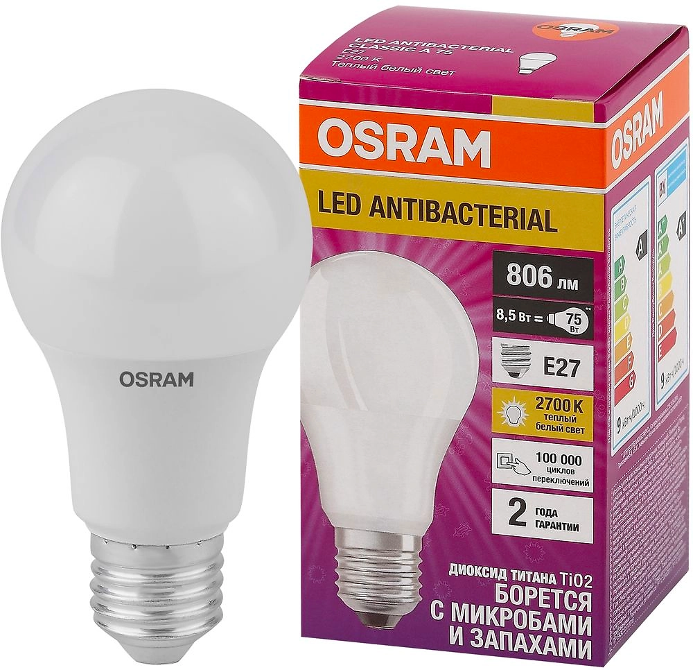 Светодиодные лампы для общего освещения, которые уничтожают бактерии и микробы благодаря фотокаталитическому покрытию колбы. Лампы OSRAM LED Antibacterial получили лабораторное подтверждение эффективности от МГЦД. Согласно ему, 2 лампы в помещении 32 куб.м за 24 часа уничтожают золотистый стафилококк на 93-97%. Лампа оснащена цоколем типа Е27, который подходит для большинства светильников.