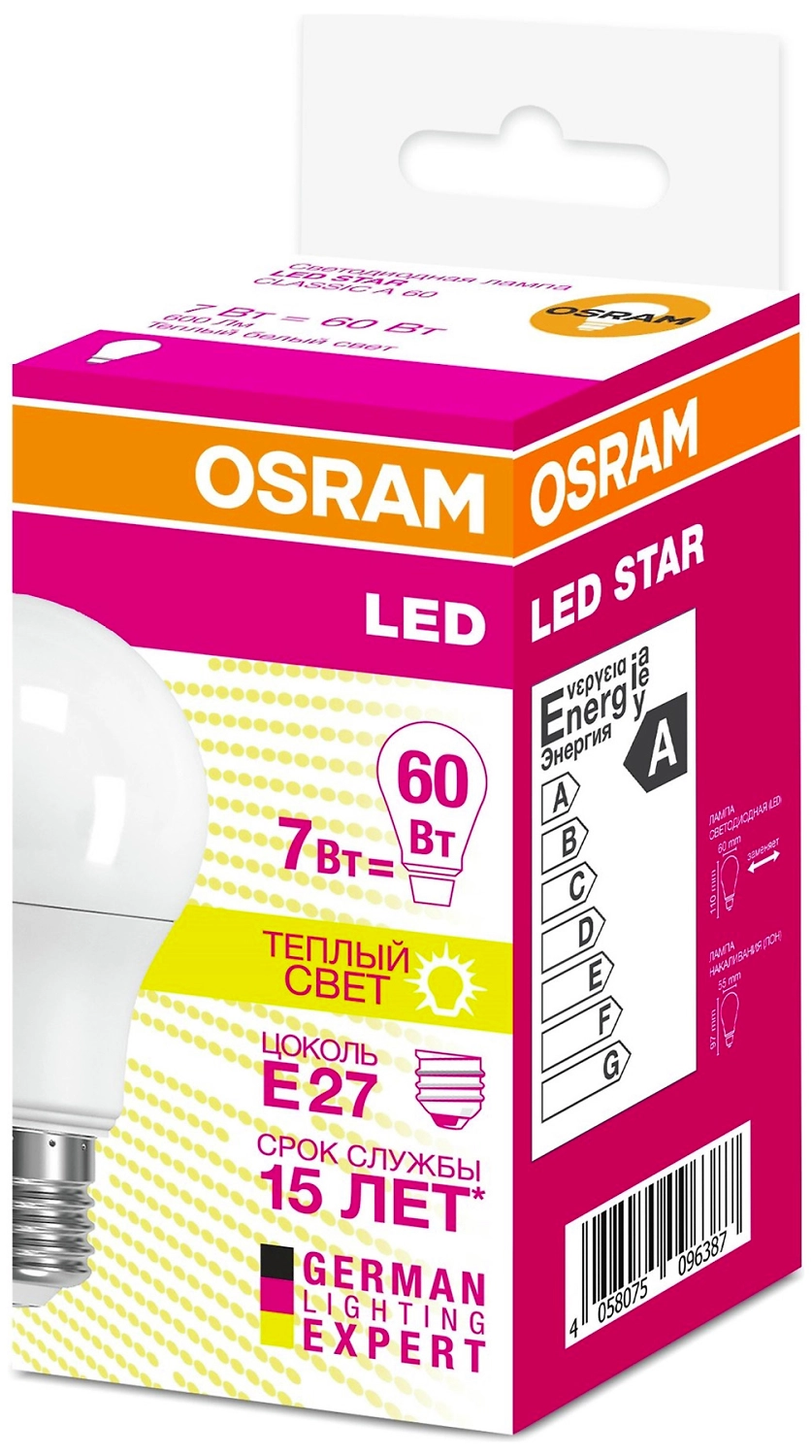 Светодиодная лампа OSRAM CLASSIC A E27 7 Вт рефлекторная 600 лм 2700 К груша