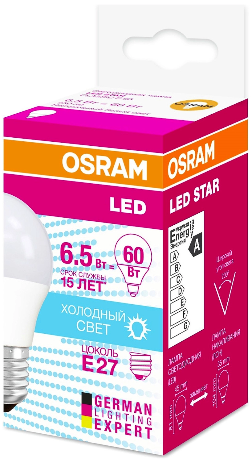 Светодиодная лампа OSRAM E27 6,5 Вт рефлекторная 550 лм 4000 К шар относится к классу энергоэффективности А. Это экономичный и долговечный источник света, современная замена устаревшим лампам накаливания.