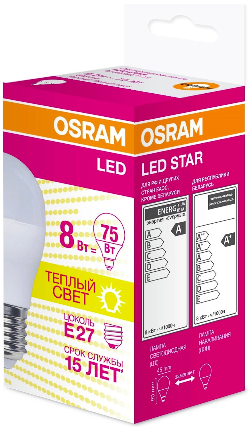 OSRAM E27 8 Вт - светодиодная лампа с белым теплым свечением, аналог лампы накаливания на 75 Вт.