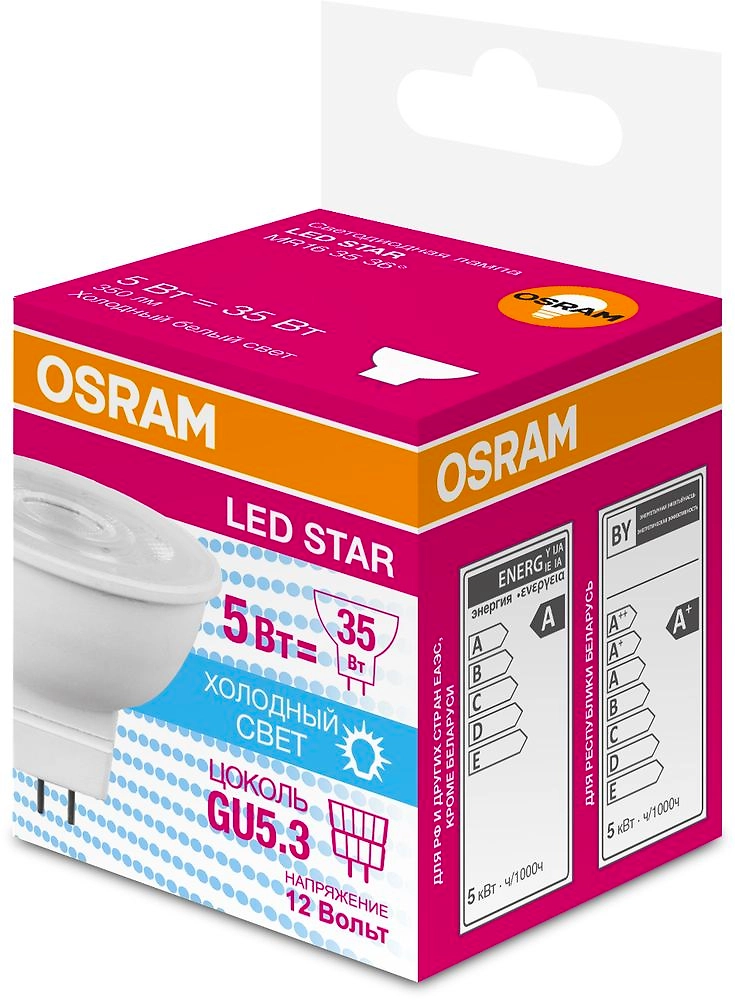 Светодиодная лампа OSRAM GU5.3 - современная энергоэффективная альтернатива лампе накаливания мощностью 35 Вт. Рефлекторная LED-лампа с удобным штырьковым цоколем излучает световой поток 360 лм.