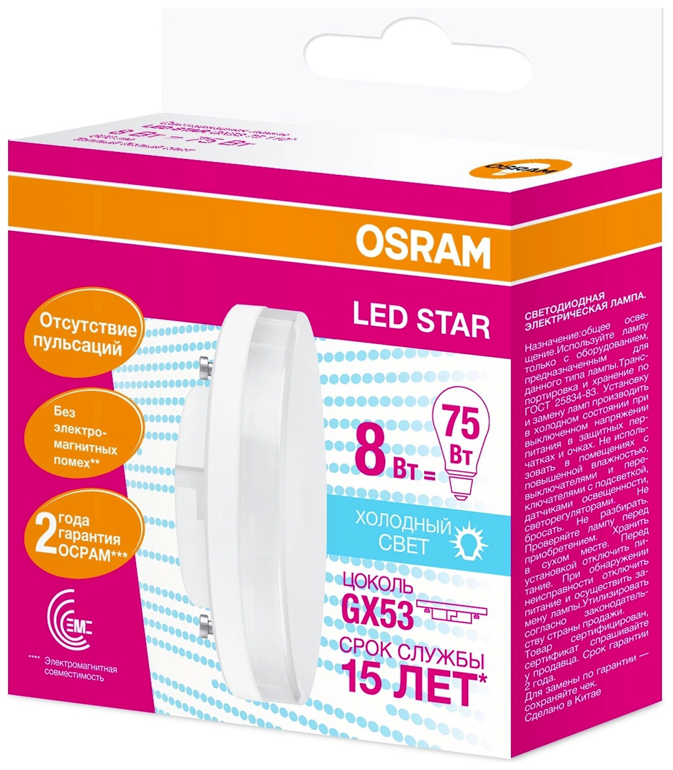 Светодиодная лампа OSRAM GX53 8 Вт 840 лм таблетка с матовой колбой - энергоэффективный источник питания, эквивалентный обычной лампочке мощностью 75 Вт.