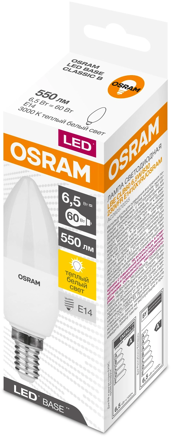 Светодиодная лампа OSRAM LED BASE CLASSIC В 6,5 Вт - аналог лампы накаливания мощностью 60 Вт. Источник света имеет цветовую температуру 3000 К, что соответствует теплому белому свету.