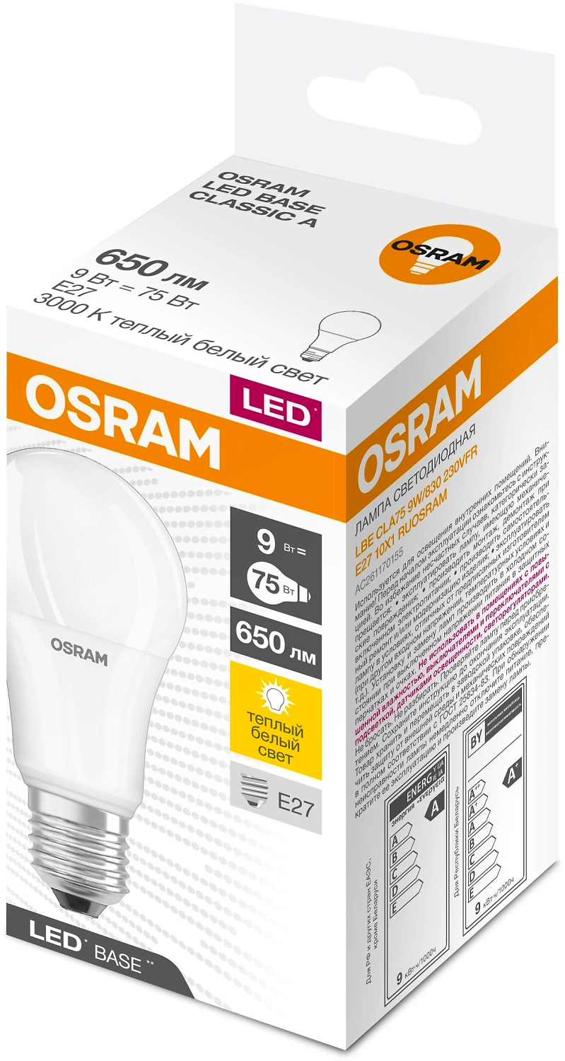 Светодиодная лампа OSRAM LED BASE CLASSIC A - энергоэффективный источник теплого белого света с распространенным типом цоколя Е27. Изделие имеет классическую форму груши.
