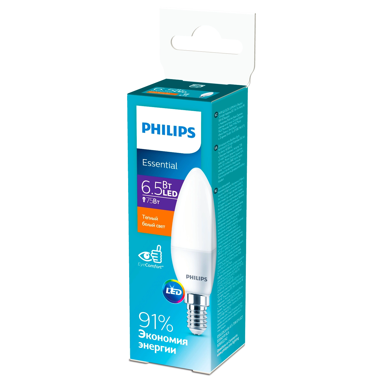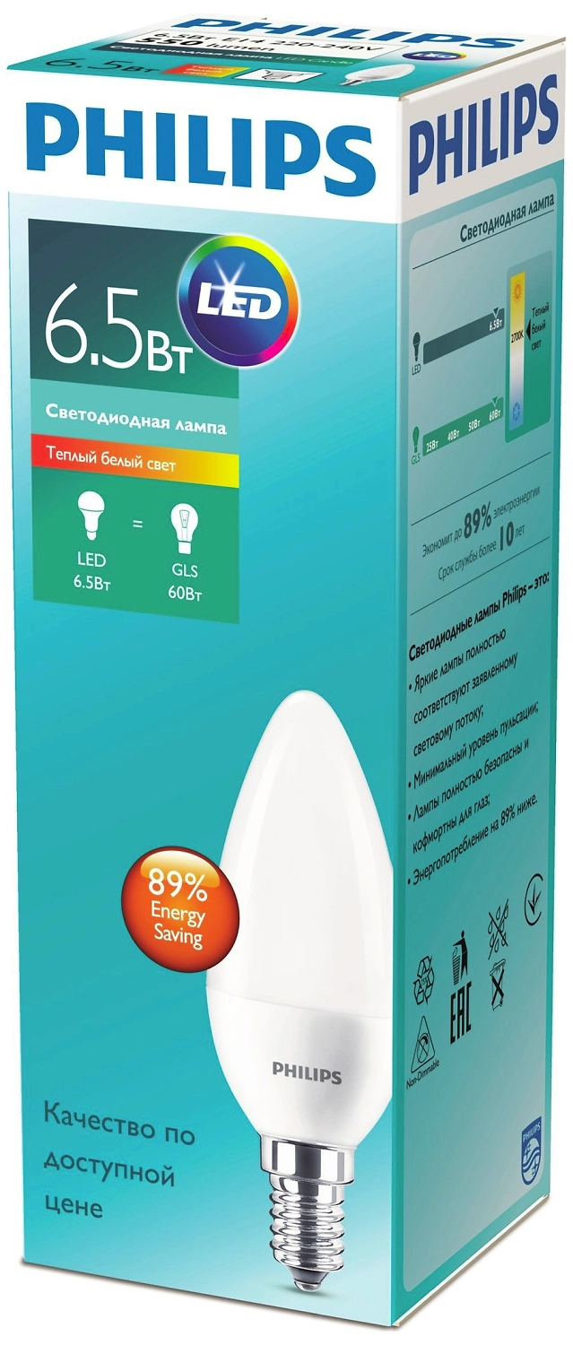 - Philips Е14 6,5 Вт потребляет на 89% меньше энергии, в отличие от ламп накаливания.