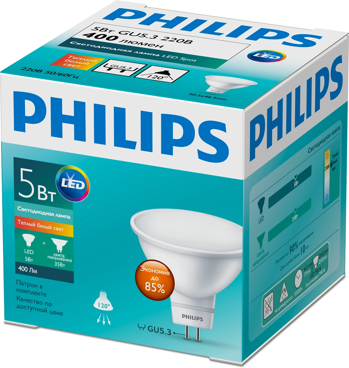 Philips Essential LED spot GU5.3 5 Вт - компактная светодиодная лампа-спот с теплым белым свечением.