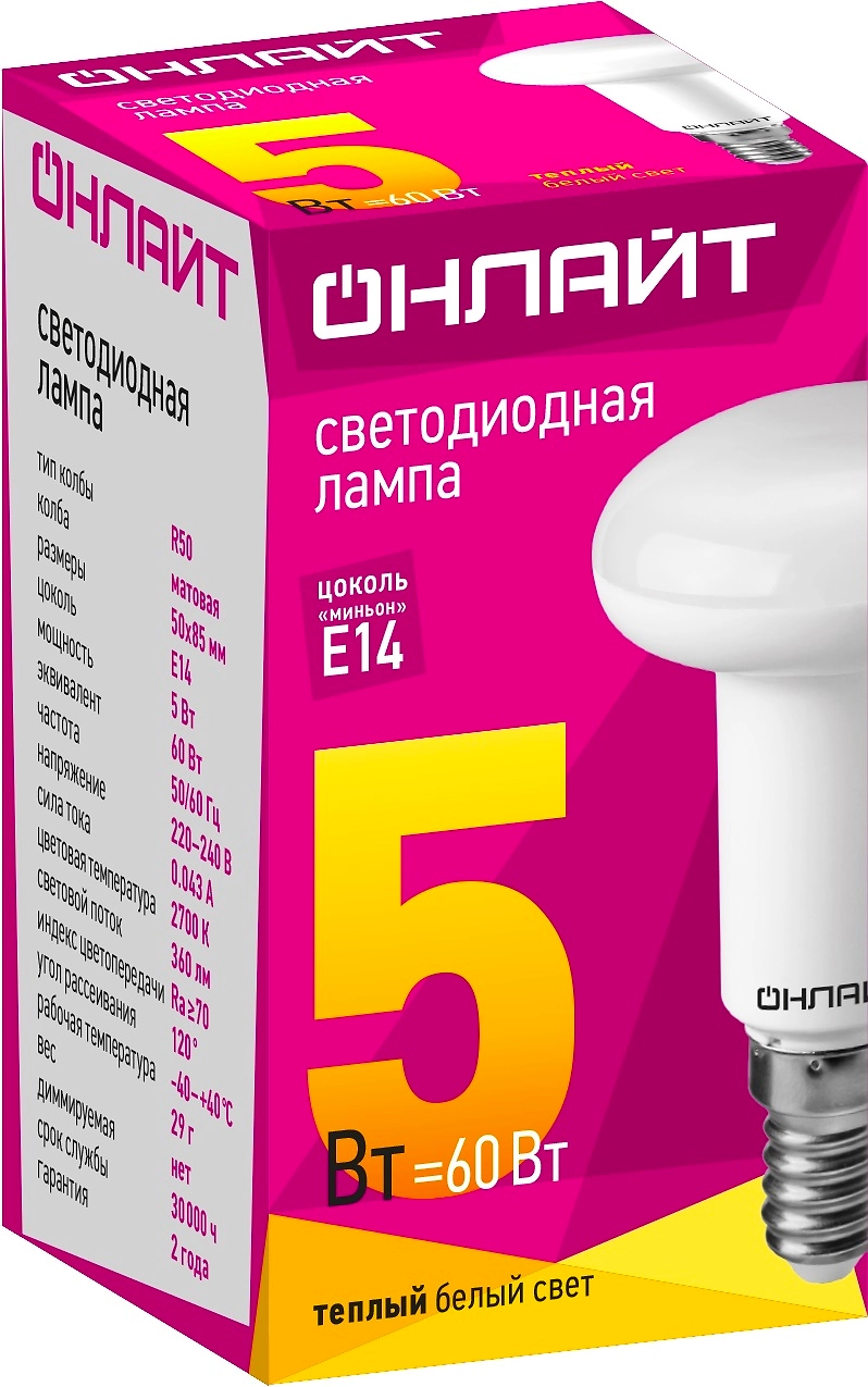 Светодиодная лампа рефлектор Онлайт R50 1ХЕ14х5 Вт 2700К