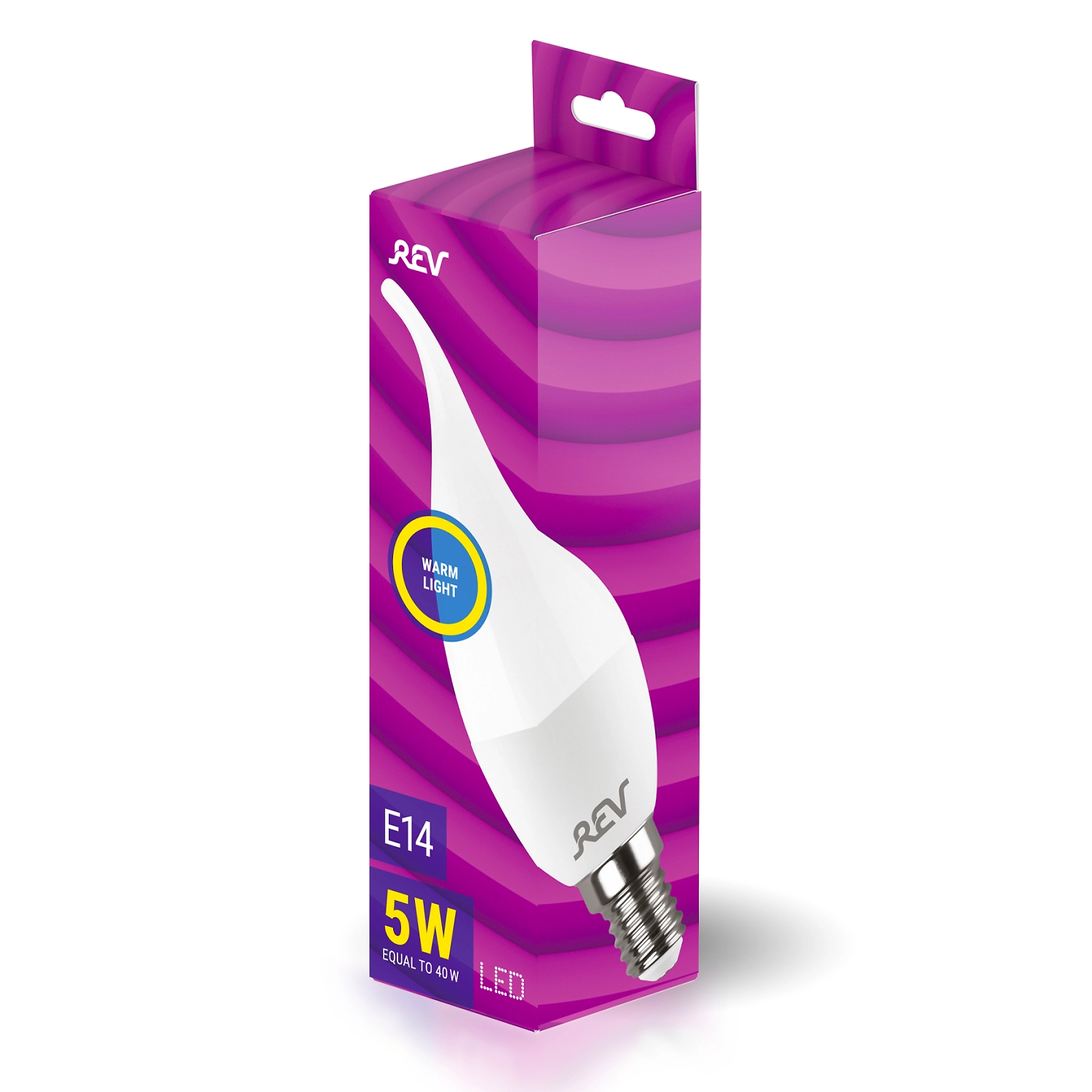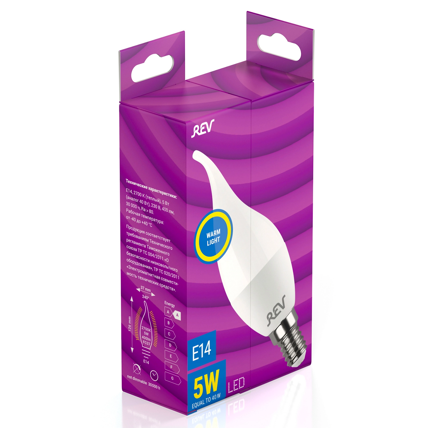 Светодиодная лампа REV оснащена винтовым цоколем E14 и матовой белой колбой в форме "свечи на ветру". Современный долговечный и экономичный источник света потребляет всего 5 Вт мощности, в то время как эквивалентная по яркости лампочка накаливания расходует 40 Вт электроэнергии.