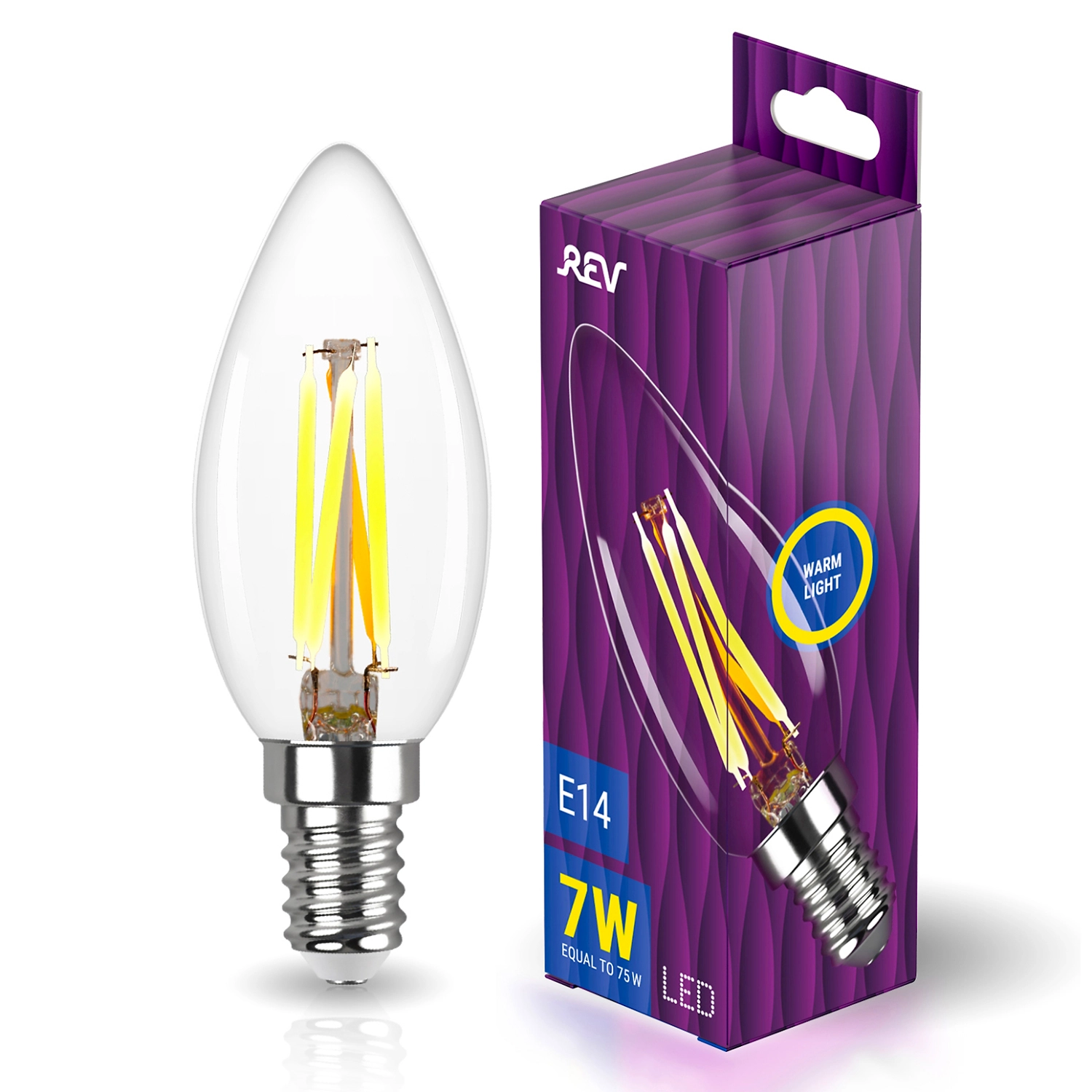 REV Filament Е14 7 Вт - светодиодная лампа теплого света, выполненная в виде свечи. Диоды особой формы имитируют нити лампы накаливания, обеспечивая декоративный вид лампочки.
