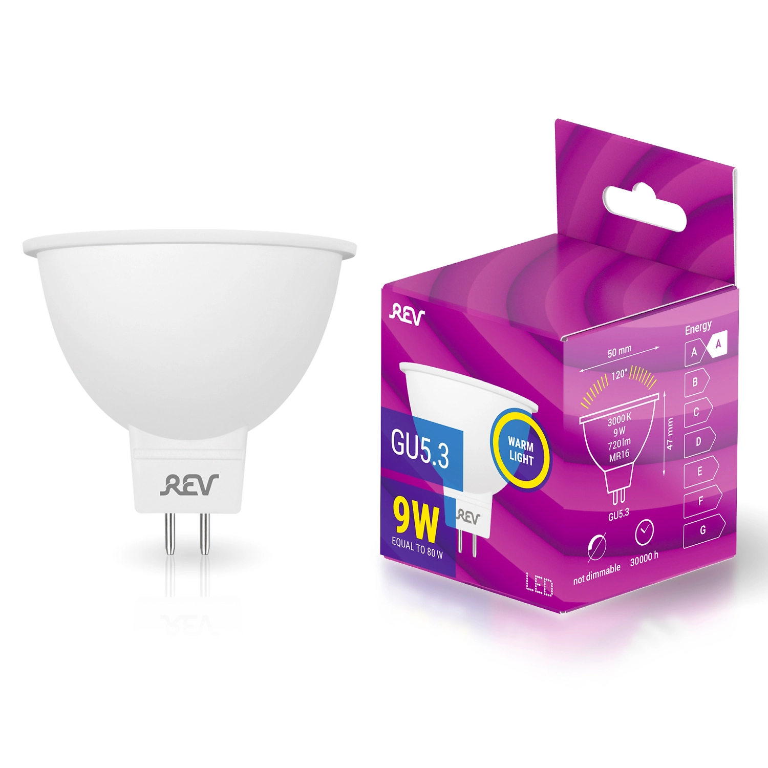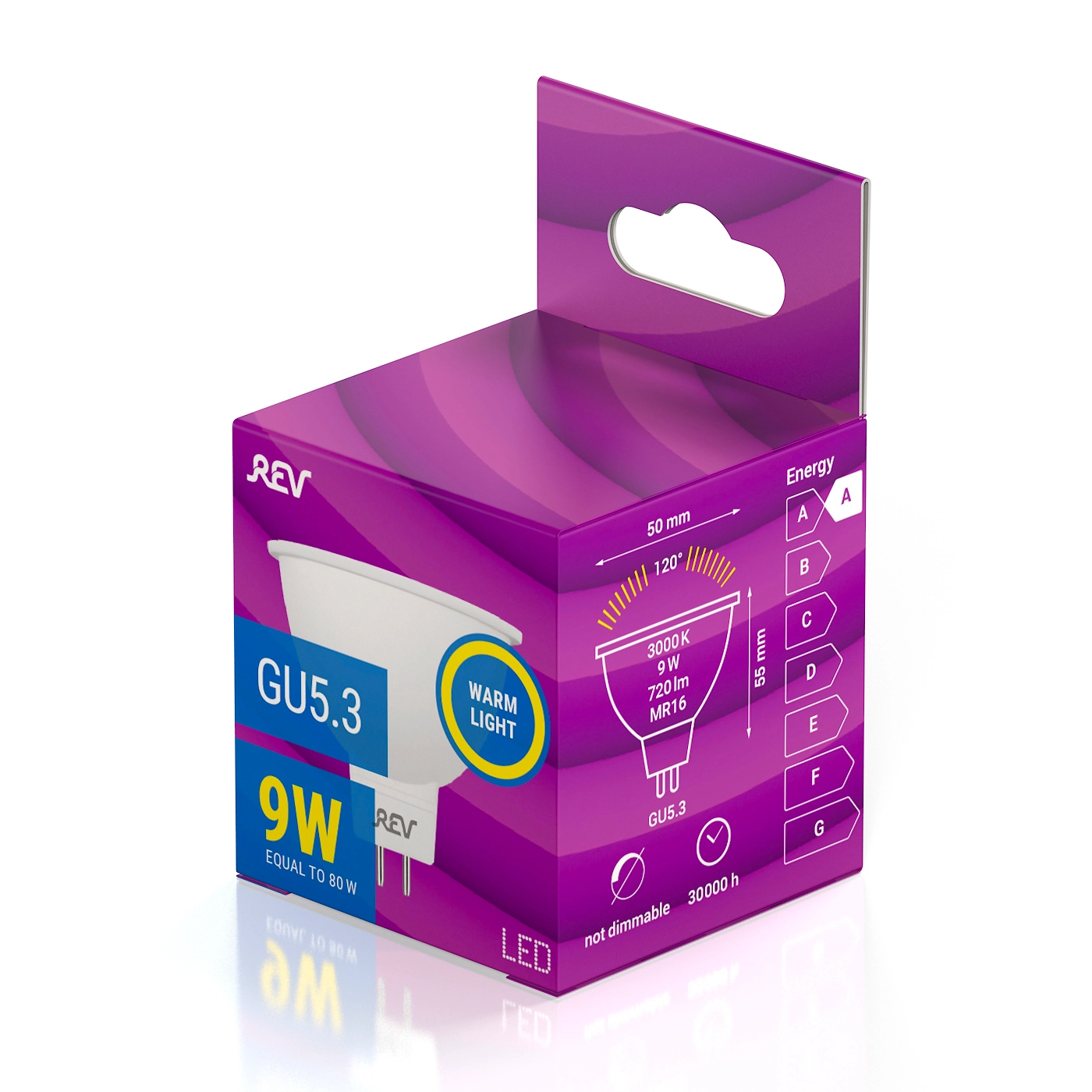 Светодиодная лампа REV оснащена удобным штырьковым цоколем GU5.3, рефлектором и матовым стеклом для мягкого рассеивания света. Энергоэффективный прибор существенно экономит электричество, поскольку при мощности 9 Вт светит также ярко, как 80-ваттная лампа накаливания.