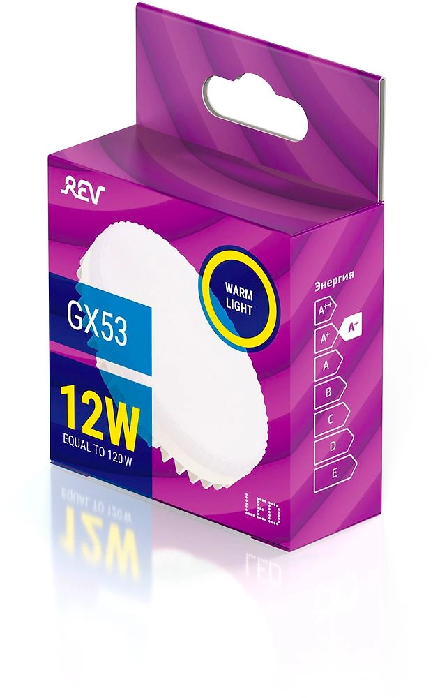 REV GX53 12 Вт - энергоэффективная светодиодная лампа теплого свечения, выполненная в форме приплюснутого цилиндра.