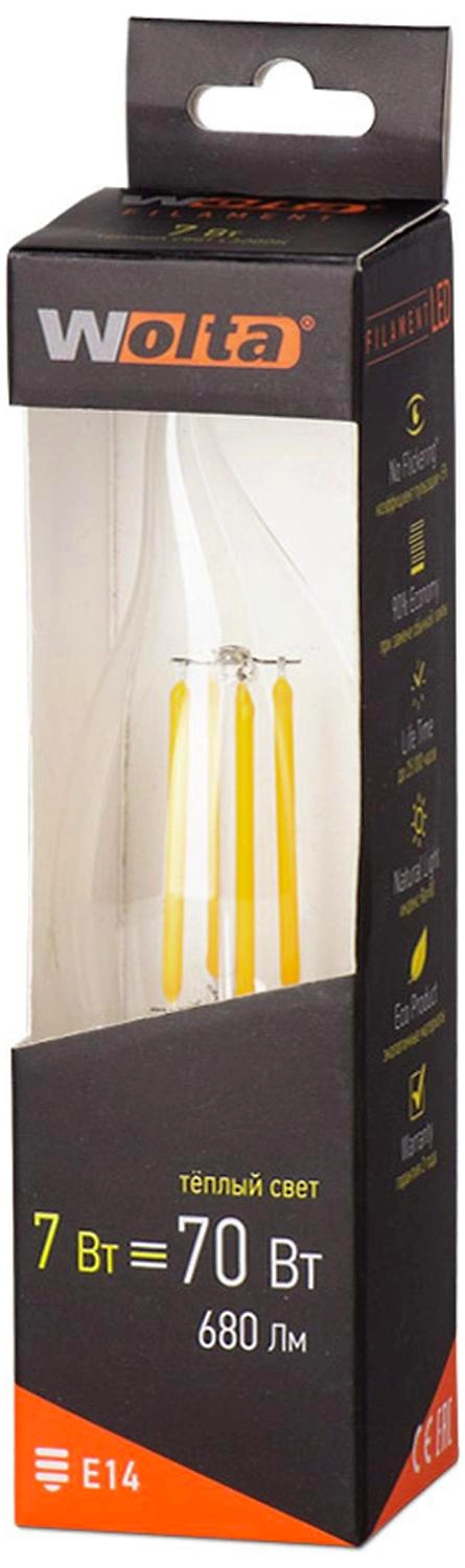 Светодиодная лампа Wolta E14 - энергоэффективный источник света с колбой изогнутой формы, имитирующей пламя свечи. Благодаря филаментным нитям светодиодная лампа напоминает традиционную лампочку накаливания, но потребляет в 10 раз меньше мощности при аналогичном уровне яркости.