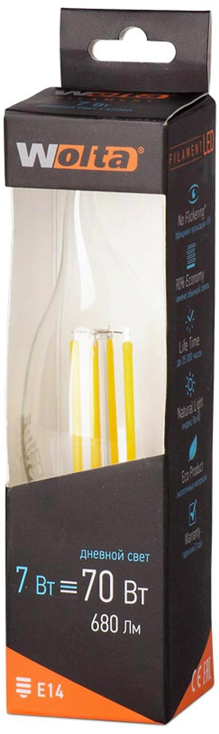 Светодиодная лампа Wolta E14 - экономичный источник света с колбой изогнутой формы, имитирующей пламя свечи. Благодаря филаментным нитям LED-лампа напоминает традиционную лампочку накаливания, но при аналогичном уровне яркости расходует в 10 раз меньше электроэнергии.